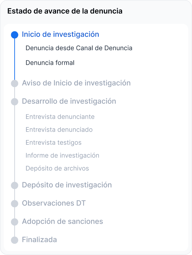 Recepciona, gestiona y monitorea tus denuncias. Conduce investigaciones con total fluidez, automatiza tus interacciones con la Dirección del Trabajo y cierra tus procesos con máxima seguridad y precisión, incluso al gestionar múltiples casos en paralelo.